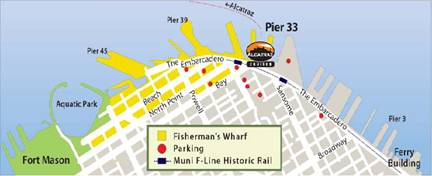 PARKING NEAR THE ALCATRAZ CRUISES DOCK 1) Parking in the vicinity of the Alcatraz Cruises Dock costs 13-15 dollars for the day). 2) DO NOT utilize a parking space with a PARKING METER. They are only good for two hours. 3) As a general thing, the farther you park from Fisherman’s Warf the lower the price. 4) If you have a bunch of stuff to unload and transport to the island, such as cooking gear, contact Event Coordinator, John Nevins well ahead of time to make arrangements. The RED DOTS on the Map, above, indicate the location for parking lots and garages near the Alcatraz Cruises Dock. Directions to the Alcatraz Cruises Dock (Hornblower, Pier 33) Driving from the South To reach Hornblower Alcatraz Landing from the south, take Highway 101 North and follow the signs towards the Bay Bridge. Take the 4th Street exit, then turn left onto Bryant Street. Follow Bryant St. to The Embarcadero. Turn left onto The Embarcadero and continue north approximately 1.7 miles to the Hornblower Alcatraz Landing at Pier 33. Driving from the North To reach Hornblower Alcatraz Landing from the north, take Highway 101 South across the Golden Gate Bridge. Take the Marina exit onto Marina Blvd. Follow Marina Blvd. to Bay Street. Turn left onto Bay Street and stay on Bay all the way to The Embarcadero. Hornblower Alcatraz Landing at Pier 33 is located at the intersection of Bay Street and The Embarcadero. Driving from the East To reach Hornblower Alcatraz Landing from the east, cross the Bay Bridge into San Francisco. Take the Fremont Street exit, and turn left onto Fremont. Follow Fremont St. to Howard, and then turn right on Howard Street. Follow Howard to The Embarcadero. Turn left onto the Embarcadero and continue north approximately 1.7 miles to the Hornblower Alcatraz Landing at Pier 33. THINGS TO KNOW – IMPORTANT! No Parking on the Alcatraz Cruises Dock There is very limited parking on the dock. All of the spaces are allocated by the National Park Service. Those participants with large loads may be given a parking space on the dock. Please don’t count on it. Any participant who needs one of these spaces must receive approval well in advance. How well in advance? If you’re reading this, now is the time to call the event coordinator. You may drop off people and/or equipment at the dock before parking elsewhere. Boarding the Ferry Maritime Law now requires that everyone boarding the ferry present a valid I.D. (California Drivers License, etc.) Weapons Inspection Prior to boarding the ferry, weapons, cartridge boxes, cap pouches, etc. will be inspected by a NPS Law Enforcement Ranger and FOCWA safety officer, pursuant to Maritime Law. If you are bringing a weapon (including swords), you must be on the Alcatraz Cruises Dock available for inspection not later than 8:15AM on the morning of the event. Per law enforcement, there will be NO EXCEPTIONS made for late arrivals. OTHER INSPECTIONS Please arrive at the Alcatraz Cruises Dock NOT LATER THAN 8:30AM. Maritime Law (post 9-11) also requires inspection of other items such as boxes being taken on board the Alcatraz Ferry. NPS Volunteers You will be asked to officially sign on as National Park Service Volunteers. No commitment other than this day on the island is implied. As a NPS Volunteer, there is no charge for transport to or from Alcatraz Island. DAY OF THE EVENT CONTACTS, USE THE FOLLOWING CONTACTS: John Nevins, Event Coordinator, FOCWA: 916-599-6642 Brad Schall, Co-chairman, FOCWA: 510-867-5106 National Park Service, Alcatraz: 415-561-4900 (after 9:00AM) Alcatraz Cruises: 415-981-7625 WHAT YOU CAN DO TO HELP THE EVENT • Arrive Early • Register Early for the event. If something happens and you can’t make it, please let us know ASAP in case there are people on the waiting list.
